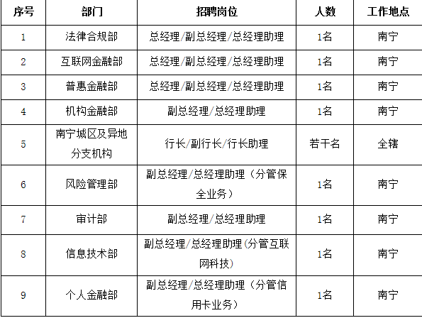 7. 南寧城區(qū)及異地分支機(jī)構(gòu)應(yīng)聘者具備較強(qiáng)的市場(chǎng)敏銳性和開拓能力、客戶資源豐富、有分行級(jí)負(fù)責(zé)人任職經(jīng)歷者優(yōu)先。