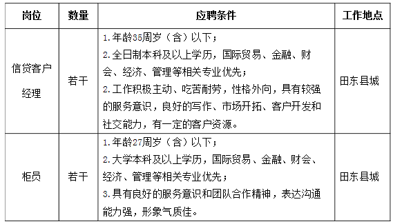 2019年田東北部灣村鎮(zhèn)銀行員工招聘啟事