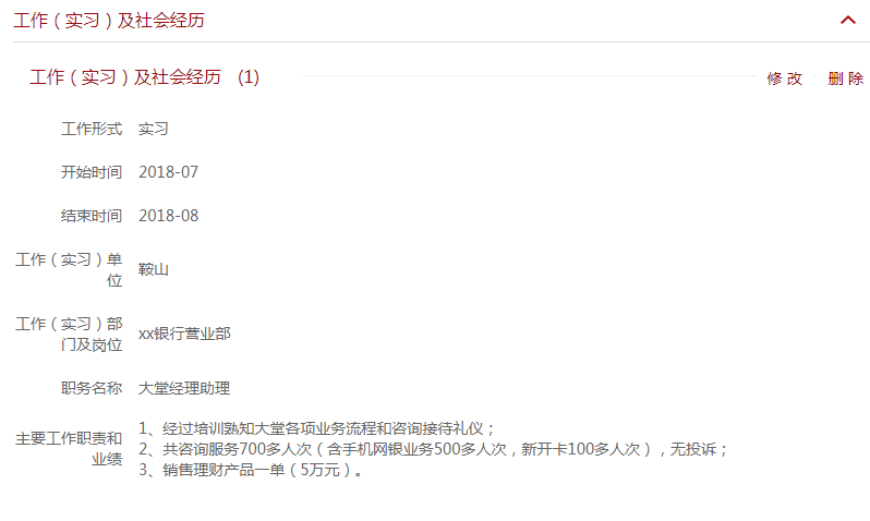 同時(shí)也是因?yàn)楹芏鄬W(xué)生沒(méi)有正規(guī)的實(shí)習(xí)只有一些零散的兼職活動(dòng),這里的話就盡量寫(xiě)和同學(xué)所報(bào)銀行崗位相關(guān)的一些兼職經(jīng)歷,描述過(guò)程中注意用詞盡量用數(shù)據(jù)和技能說(shuō)話。