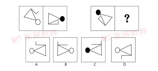【東吳教育解析】首先,每組圖形中一個黑球,一個白球,問號處應選擇含有白球的選項,排除C;第一組圖形,三角形連著圓圈作為整體逆時針旋轉30°左右,且鉤形圖調換位置,按照這個規律,第二組圖形,先整體逆時針旋轉30°,排除B;再將鉤形圖調換位置,A項符合。