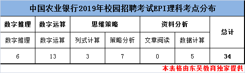 中國農業銀行筆試EPI考試模塊為:言語理解、數字運算、邏輯推理、思維策略和資料分析。。