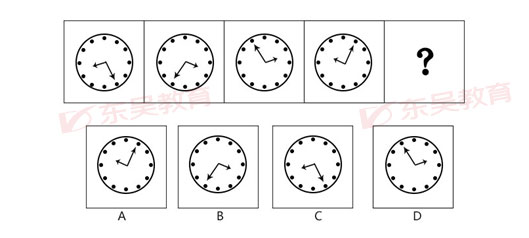 【東吳教育解析】從第一個圖形開始,短針每次逆時針旋轉4、2、4、(2),長針每次順時針旋轉2、4、2、(4),按照這個規律,答案選C。