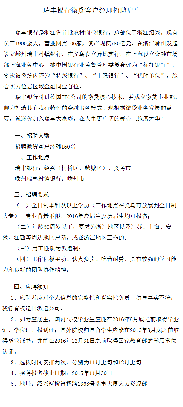 [浙江]瑞豐銀行微貸客戶經理2015年招聘啟事