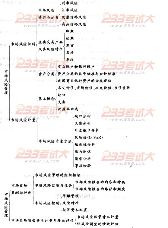 2012年銀行從業資格考試《風險管理》第四章知識精講 第四章 市場風險管理 本章考情分析 市場風險是考試的重點。本章主要考查考生對市場風險的整體把握,包括市場風險的分類,主要衍生產品及其與市場風險之間的關系,市場風險不同計量方法的基本原理、適用范圍、主要作用及其優點和局限性。 本章基本架構