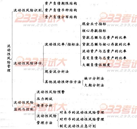 本章主要是要求考生把握流動風(fēng)險的資產(chǎn)負債期限結(jié)構(gòu)、幣種結(jié)構(gòu)、分布結(jié)構(gòu),流動性比率指標(7個指標),缺口分析法和久期分析法,流動風(fēng)險的預(yù)警和如何運用壓力測試法和情景分析法對未來流動性狀況作出預(yù)測,以及我國商業(yè)銀行目前普通采用的流動性風(fēng)險管理方法。