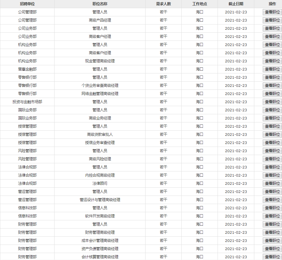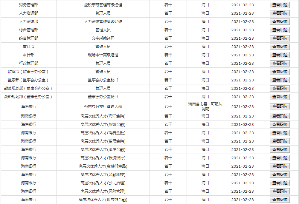 為進一步加強人才隊伍建設,率先建立與自由貿易區(港)需求相匹配的金融服務架構,提升服務自由貿易區(港)和美好新海南建設的能力和水平,現啟動2019年社會招聘工作,面向境內外誠邀有志于攜手海南銀行共同發展的國際化、專業化、復合型、創新型人才加盟。我行將為各類人才提供廣闊的成長發展空間、豐富的培訓提升資源、領先于市場競爭力的薪酬待遇和健全完善的福利保障(包括外來高端人才購房、家屬就業、子女入學等相關配套措施),具有國際化視野的高端金融人才應聘我行,崗位、職務、薪酬均可面議。