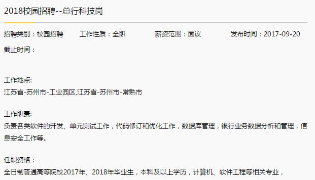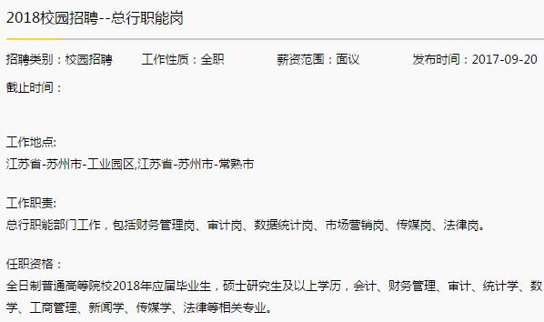 主頁 > 農村商業銀行招聘 > 常熟農商銀行招聘 > [江蘇]2018年常熟農商行總行校園招聘公告
