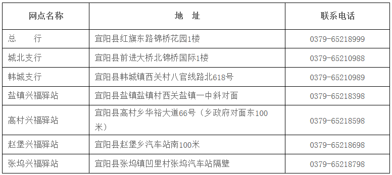 下載打印并填寫《宜陽興福村鎮銀行工作人員應聘報名表》,核對完整、無誤后送至以下報名點: