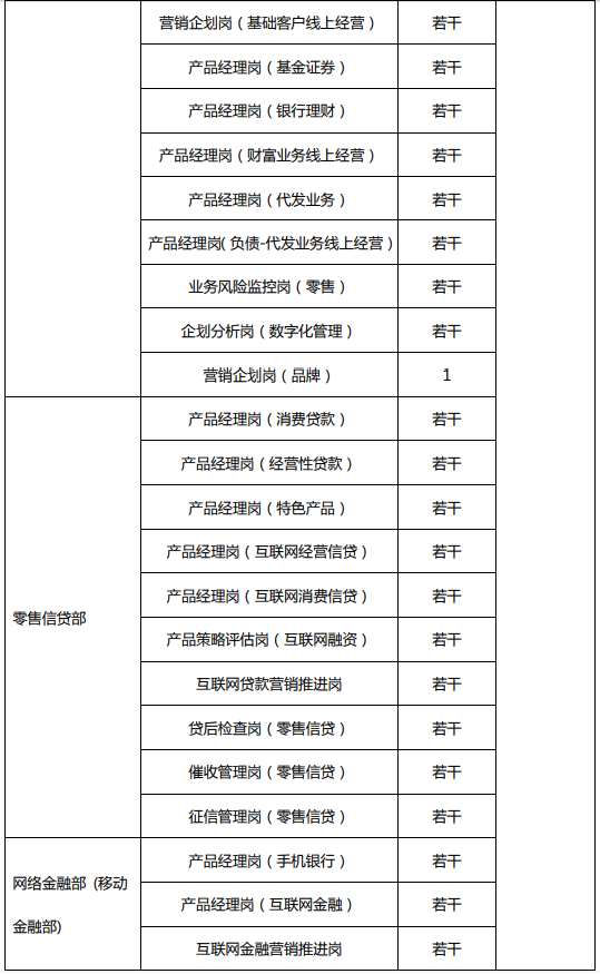 應聘條件:35周歲以下;金融、經濟、計算機等相關專業全日制本科及以上學歷;3年以上銀行或其它金融行業從業經驗;熟悉零售銀行財富管理類業務,具備良好的文案撰寫能力、營銷策劃和組織推動能力、數據分析能力,以及較強的溝通協調能力;具有零售銀行財富管理資產配置或量化數據研究、互聯網營銷相關工作經驗,具備基金證券從業資格或持有CFA證書者優先。