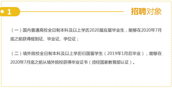 (一)國內(nèi)普通高校全日制本科及以上學歷2020屆應屆畢業(yè)生,能夠在2020年7月底之前獲得報到證、畢業(yè)證、學位證;