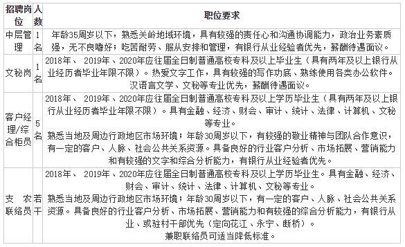 備注:客戶經(jīng)理綜合素質(zhì)突出、有豐富客戶資源、人脈資源和社會公共關(guān)系資源者,上述職位要求可適當放寬條件。