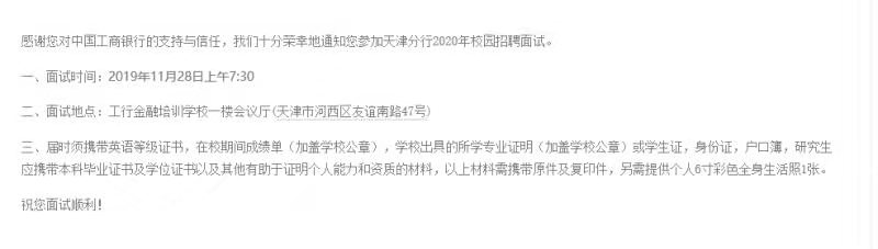 [天津]2020年中國工商銀行天津分行校園招聘面試通知