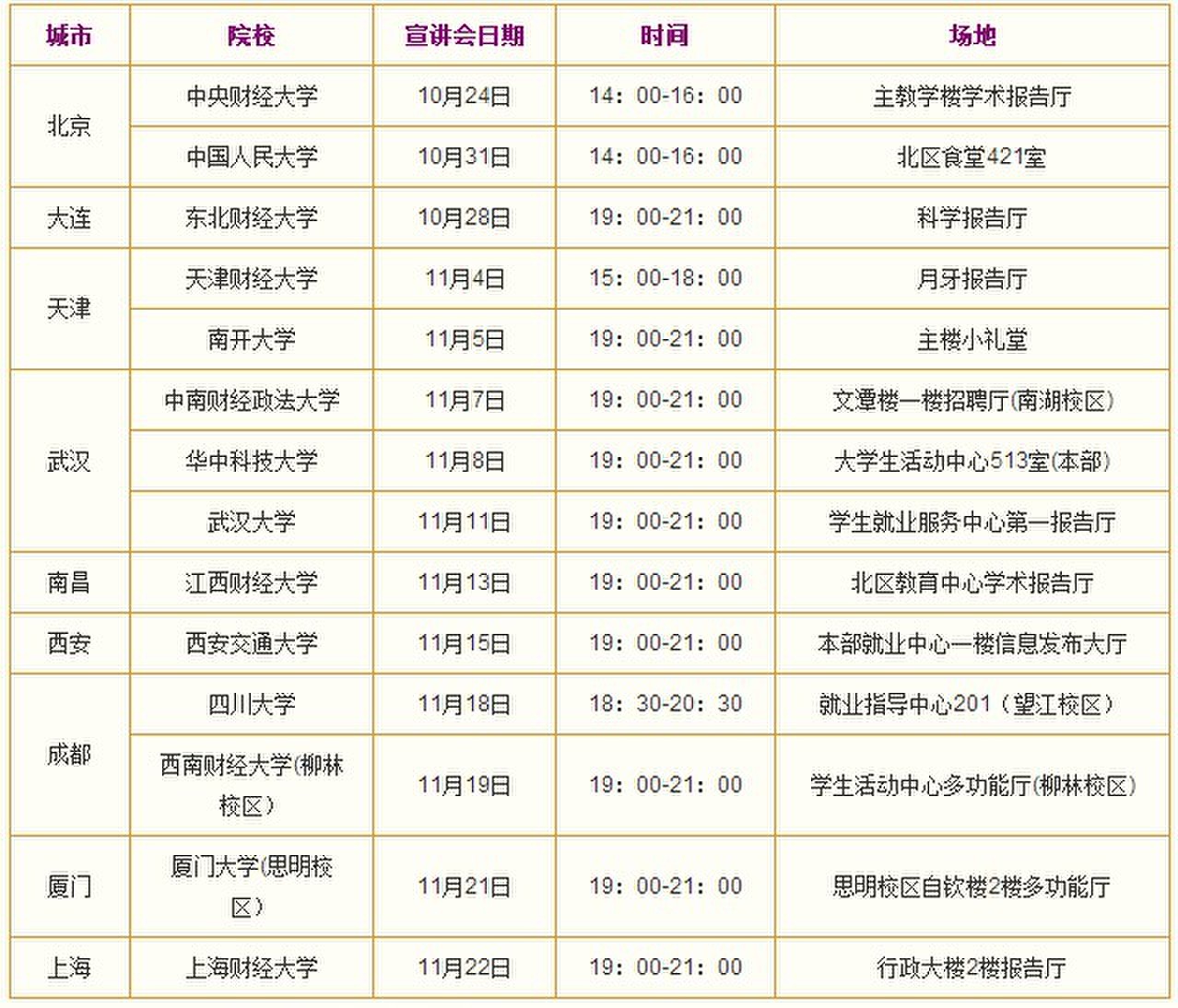 光大銀行2014校園招聘宣講會(huì)行程表