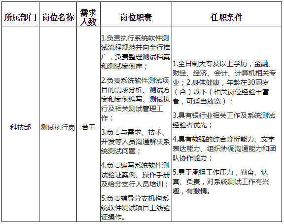 因業務發展需要,現面向社會公開招聘總行科技部測試執行人員(勞務派遣)。