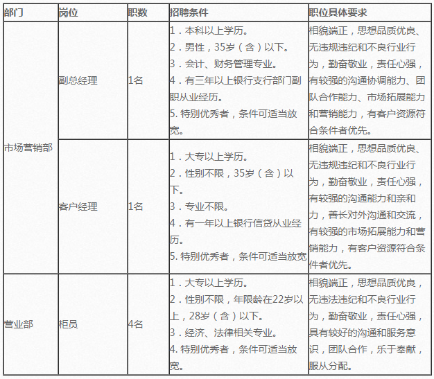 貴州銀行發(fā)起成立的新型農(nóng)村金融機(jī)構(gòu),是服務(wù)于白云區(qū)的地方性股份制商業(yè)銀行。本行以“服務(wù)三農(nóng),服務(wù)中小企業(yè),服務(wù)百姓”為經(jīng)營宗旨,以打造“三農(nóng)”貼心的銀行,“中小企業(yè)”稱心的銀行,“城鄉(xiāng)居民”合心的銀行為目標(biāo),致力為白云區(qū)的中、小、農(nóng)、客戶提供全方位的金融服務(wù),F(xiàn)因業(yè)務(wù)發(fā)展需要,特向社會公開招聘正式在編合同制員工,誠邀有志于同本行共同成長的優(yōu)秀人才加盟,一經(jīng)錄用將提供廣闊的發(fā)展空間及當(dāng)?shù)馗挥懈偁幜Φ男匠旮@觥?/div>