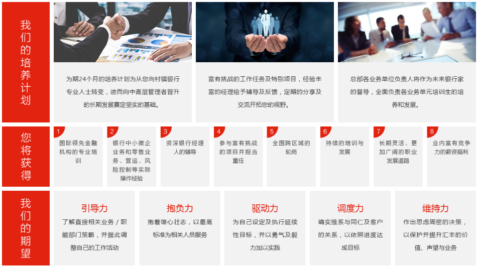 為期24個月的培養計劃為從您向村鎮銀行專業人士轉變,進而向中高層管理者晉升的長期發展奠定堅實的基礎。
