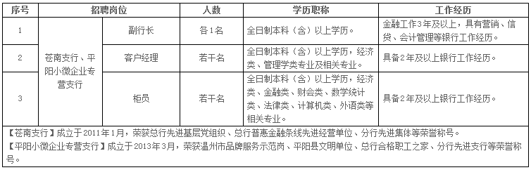 平陽等周邊重要區域設立了19家營業機構,始終秉承“敢為人先,民本和諧”的溫州人精神,立足溫州、服務溫州,支持地方經濟建設,各項業務持續、穩步、健康發展。