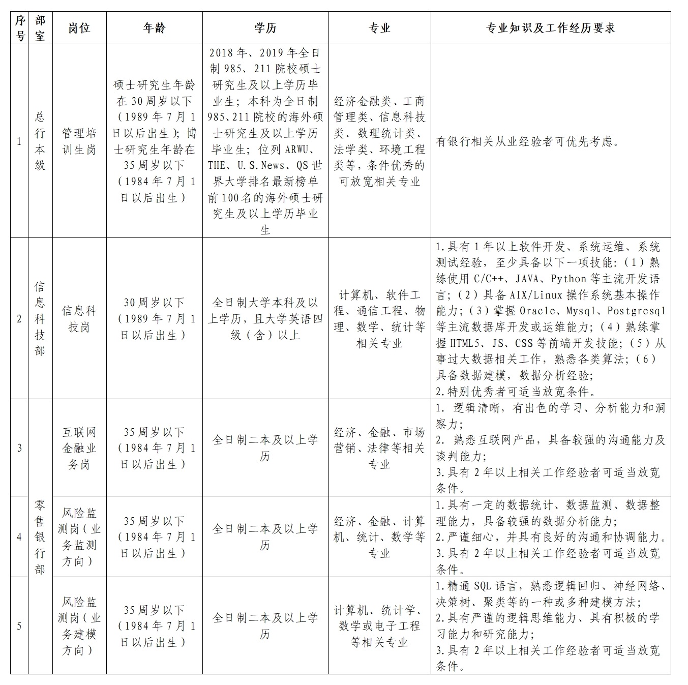 (三)零售銀行部:互聯網金融業務崗、風險監測崗(業務監測方向)、風險監測崗(業務建模方向)若干名。