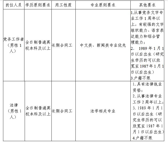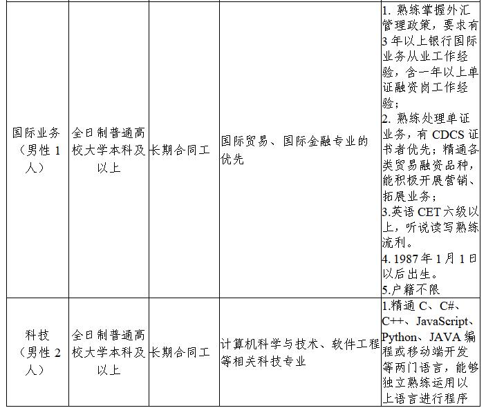(二)招收崗位、人員和要求:本次招聘分綜合類、專業(yè)培訓(xùn)生(國際業(yè)務(wù)、科技、財務(wù)管理、文秘、法律、黨務(wù)工作者)招聘,綜合類中的合同工與派遣工不能兼報。