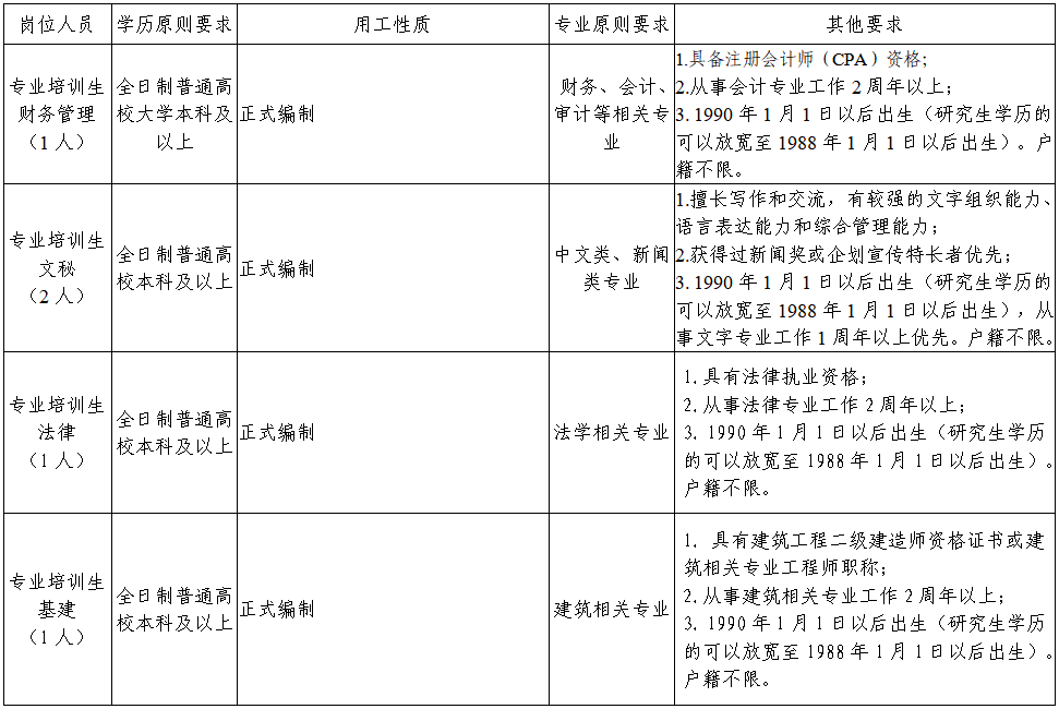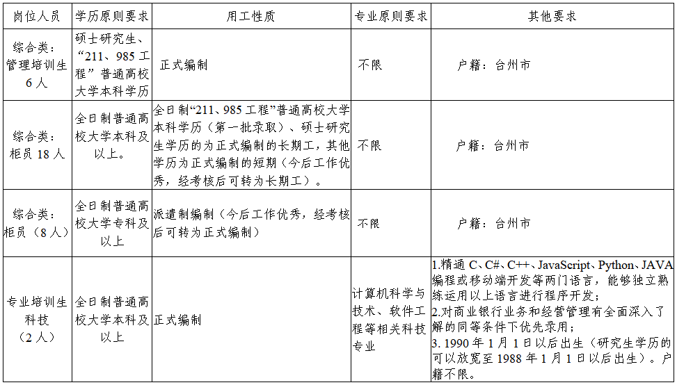 (二)招收崗位、人員和要求:本次招聘分綜合類(管理培訓生、柜員)、專業(yè)培訓生(科技、財務管理、文秘、法律、基建)招聘,綜合類柜員中正式編制柜員與派遣制柜員不能兼報。