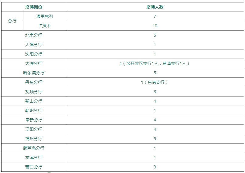 總行IT技術(shù)崗位,北京、天津、沈陽、大連、哈爾濱分行及錦州地區(qū)崗位:國家重點(diǎn)建設(shè)院校2018年應(yīng)屆全日制本科及以上學(xué)歷應(yīng)屆畢業(yè)生;