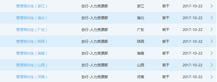 2017年秋季,第十三期管理培訓生項目招聘按北京、上海、江蘇湖北、浙江、廣東陜西湖南山西河南等10個區域定向分類招收總行管理培訓生。各區域管理培訓生由總行統一招聘、統一培養,培養期結束后定向分配到所屬區域交行經營機構工作。