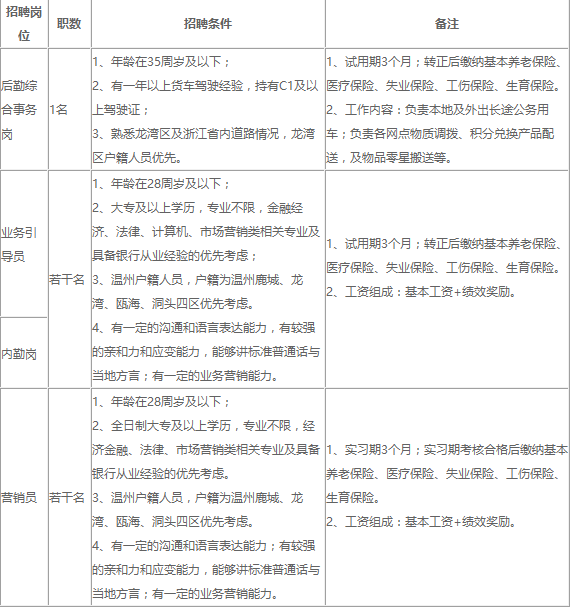龍灣農商銀行因業務發展需要,特向社會公開招聘后勤綜合事務崗、業務引導員、內勤崗、營銷員、等崗位人員,熱忱歡迎有志之士加盟。