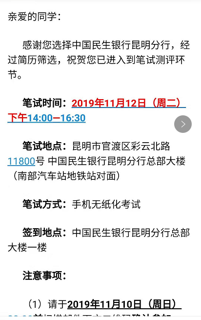 2020年民生銀行昆明分行校園招聘筆試通知公告