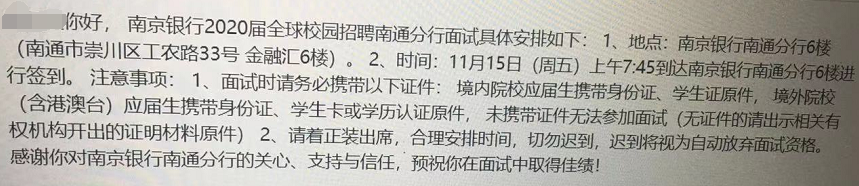 [江蘇]2020南京銀行南通分行校園招聘面試通知