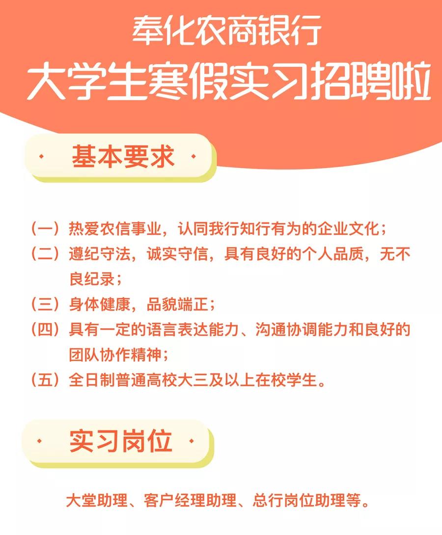 [浙江]2020年奉化農商銀行大學生寒假實習招聘公告