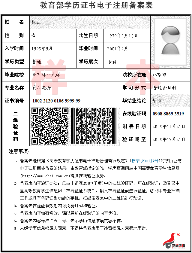 學(xué)歷證書電子注冊(cè)備案表打印件 |