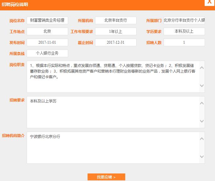 主頁 > 城市商業銀行招聘 > 寧波銀行招聘 > [北京]2018寧波銀行北京分行財富營銷類業務經理招聘公告