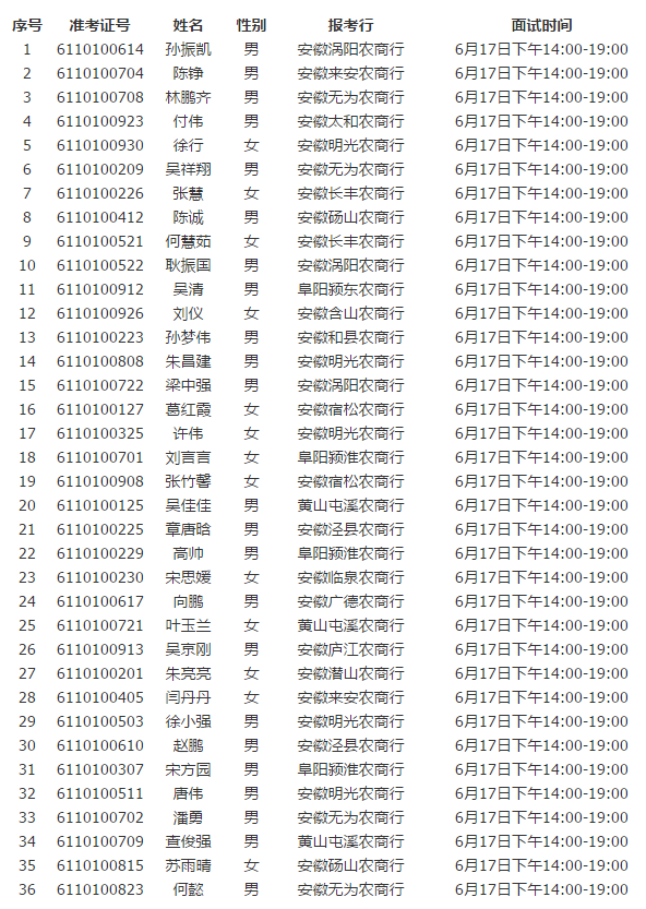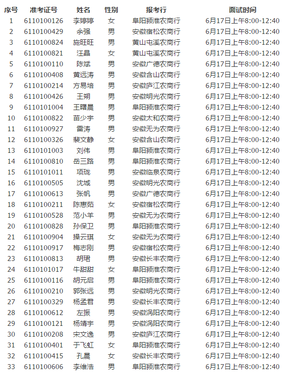 2016年安徽農村商業(yè)銀行系統(tǒng)計算機專業(yè)面試人員名單