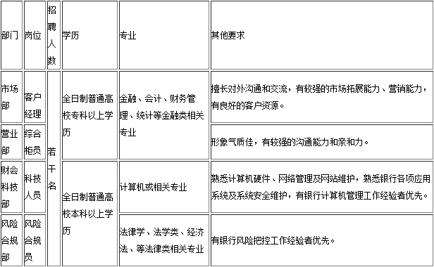開陽富民村鎮(zhèn)銀行是經(jīng)中國銀監(jiān)會批準成立的一家股份制商業(yè)銀行,由浙江溫州鹿城農(nóng)村商業(yè)銀行主發(fā)起成立的新型農(nóng)村金融機構(gòu)。我行秉承“小額、分散”的經(jīng)營理念,立足縣域、服務(wù)“三農(nóng)”、服務(wù)社區(qū),為開陽縣域客戶提供全方位的金融服務(wù)。我行現(xiàn)有員工40余人,內(nèi)設(shè)四個部室,下設(shè)楠木渡支行、龍崗支行正在籌建之中。現(xiàn)因業(yè)務(wù)發(fā)展需要,特向社會公開招聘合同制員工,一經(jīng)錄用將提供廣闊的發(fā)展空間及當?shù)馗挥懈偁幜Φ男匠旮@觥?/span>