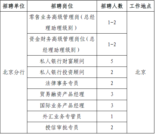 應聘條件:35 周歲及以下;全日制大學本科及以上學歷;主修國際貿易、貿易經濟等相關專業,大學英語四級或以上;5 年以的上銀行業務工作經驗或 3 年以上的從事與貿易融資、外匯相關產品營銷、管理經驗;熟悉銀行國內和國際貿易融資的相關業務、產品;了解外匯業務及相關政策;特別優秀者可以適度放寬。