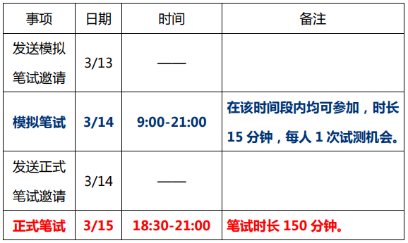 筆試將于 3 月 15 日舉行,為了幫助大家熟悉筆試流程,發揮出最佳水平,浦發銀行將于 3 月 14 日為大家安排 1 場模擬筆試。以下信息非常重要,敬請關注!