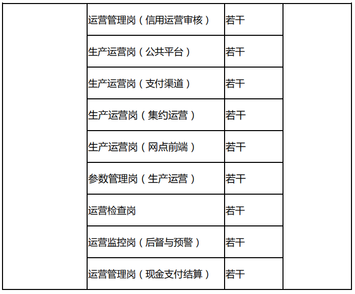 應聘條件:35 周歲以下;全日制本科及以上學歷;2 年及以上工作經驗;熟悉銀行運營相關專業理論知識與實務;熟練掌握辦公軟件,擅長數據分析;具備良好的溝通協調、語言及文字表達能力,以及較好的團隊合作精神;有總分行運營管理部門工作經驗者優先。