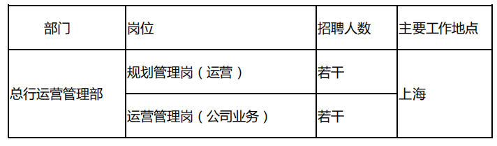應聘條件:35 周歲以下;全日制本科及以上學歷,理工類專業優先;運營或信息科技2 年及以上工作經驗;熟悉銀行運營相關專業理論知識與實務;熟練掌握辦公軟件,擅長數據分析;具備良好的溝通協調、語言及文字表達能力,以及較好的團隊合作精神;有部門團隊管理經驗、項目經驗或總分行運營管理部門工作經驗者優先。