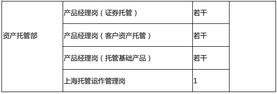 應聘條件:35周歲以下;金融學、管理學、經濟學、法律等相關專業全日制本科及以上學歷;3年以上金融行業從業經歷;具有較強的市場營銷和金融產品設計能力;熟悉私募基金、信托、互聯網金融及各類客戶資金等托管產品的某一領域或多個領域;具備一定的英
