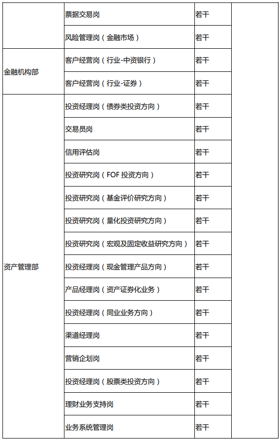 應聘條件:35 周歲以下;全日制碩士及以上學歷;5 年以上金融行業從業經驗;有應收賬款、房地產或資產證券化實際運作經驗者優先;具有金融機構資金部、產品部、審批部或券商資管工作經驗者優先;具有 CFA、CPA、FRM、證券從業資格者優先。