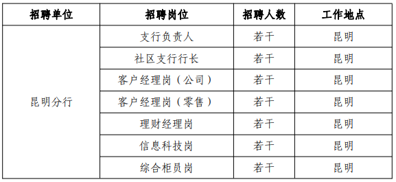 應聘條件:年齡 40 周歲(含)及以下;全日制本科(含)及以上學歷;具有 5 年以上(含)銀行相關工作經驗,或行業、區域客群經營經驗,具有銀行經營機構管理經驗;具有全局觀念,能夠深入理解總分行戰略,具有較強的組織推動、協調溝通、創新研究能力;熟悉昆明地區經濟情況,客戶資源豐富,業績優秀。