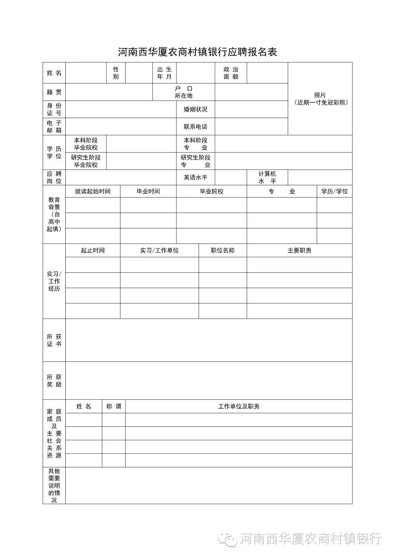 (一)應聘者請下載并如實、詳盡填寫《河南西華廈農商村鎮銀行招聘求職登記表》。進入我行微信公眾號,在“關于我們”欄目或者直接回復“應聘報名表”下載《應聘報名表》(微信號: hnxxcb888, 微信名:河南西華廈農商村鎮銀行)。應聘者應對申請資料信息的真實性負責,如與事實不符,我行有權取消其應聘資格。
