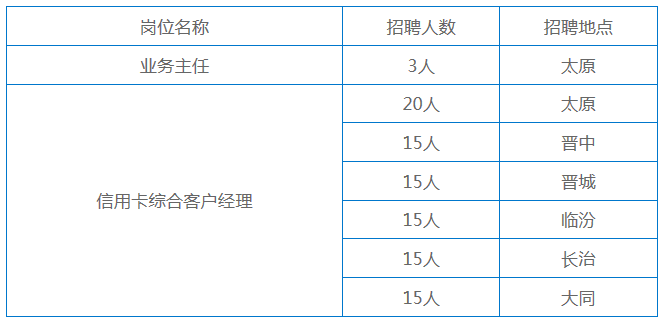 山西經(jīng)濟社會發(fā)展,服務(wù)三晉百姓生活,依法經(jīng)營,穩(wěn)健經(jīng)營,文明經(jīng)營,業(yè)務(wù)持續(xù)快速健康發(fā)展,風險控制能力不斷增強,盈利水平顯著提升,F(xiàn)因業(yè)務(wù)發(fā)展及內(nèi)部管理需要,特面向社會人員公開招聘信用卡中心業(yè)務(wù)崗優(yōu)秀人才,F(xiàn)將有關(guān)事項公告如下: