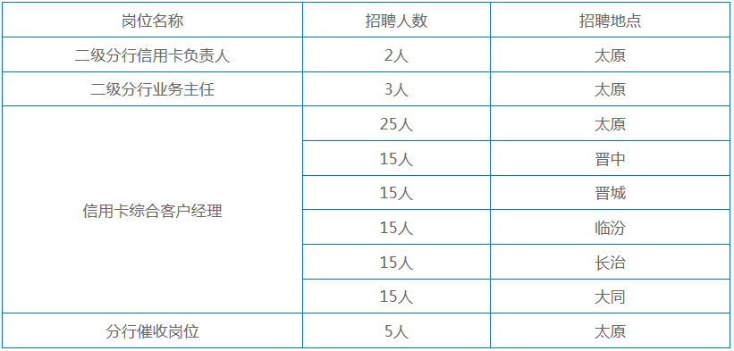 山西經濟社會發展,服務三晉百姓生活,依法經營,穩健經營,文明經營,業務持續快速健康發展,風險控制能力不斷增強,盈利水平顯著提升。現因業務發展及內部管理需要,特面向社會人員公開招聘信用卡中心業務崗優秀人才。現將有關事項公告如下: