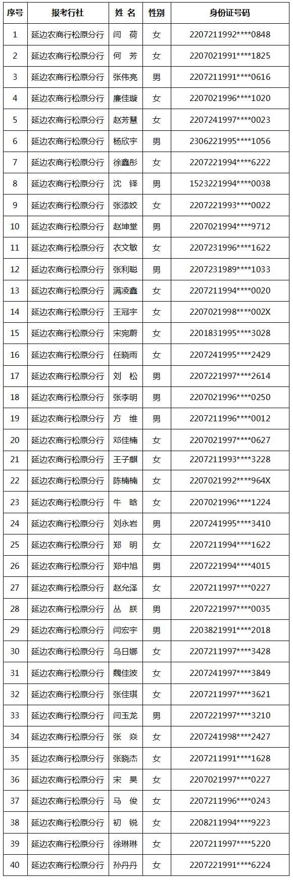2019年延邊農商行新員工招聘初選結果