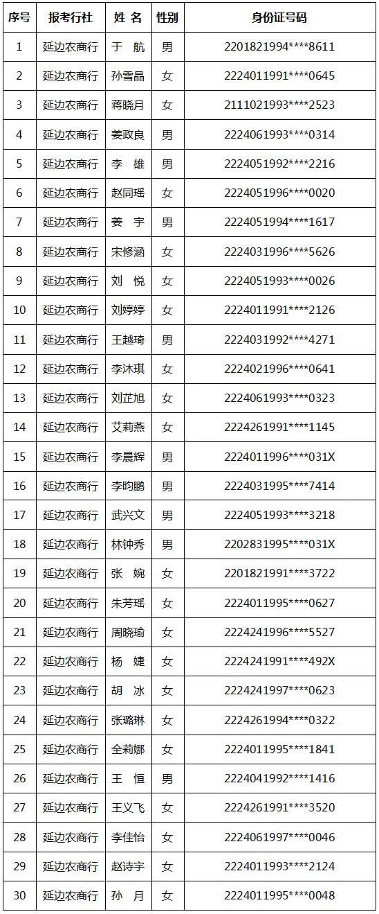 延邊農村商業銀行2019年新員工招聘初選已結束,現將初選入圍名單公布如下: