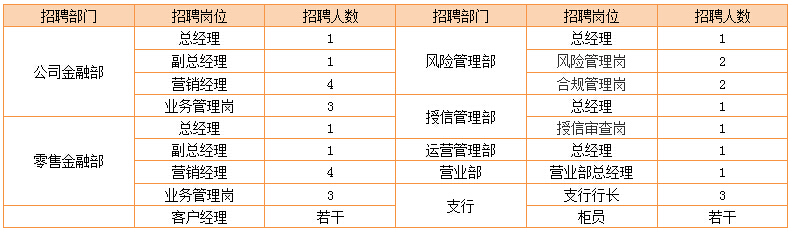 所有崗位均要求具有較強的敬業精神、創新意識和團隊合作意識;品行端正,無違規違紀等不良行為,在銀行業或監管機構無不良記錄;業績、能力特別優秀者,年齡和學歷條件可適當放寬。