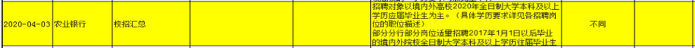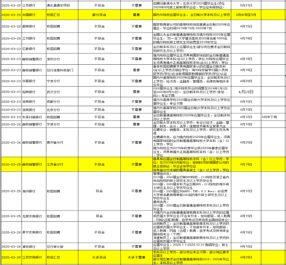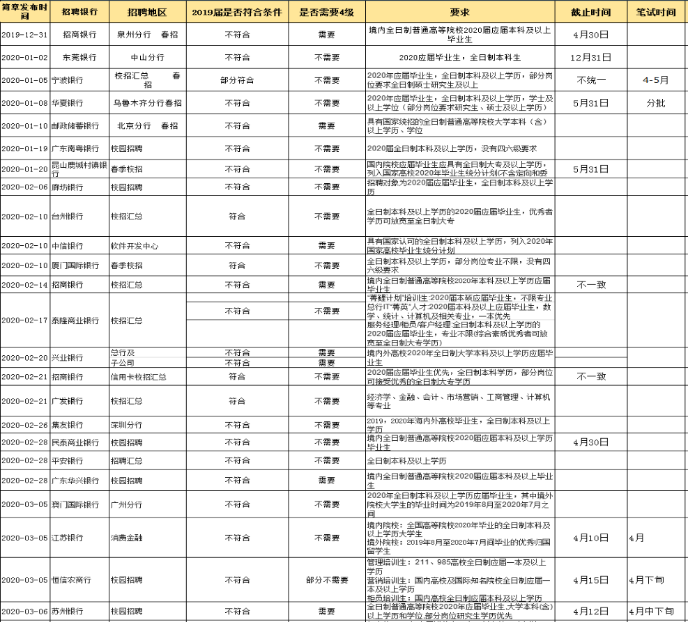 2020銀行/農商行春季校招網申及筆試時間更新表(2020年04月03日)
