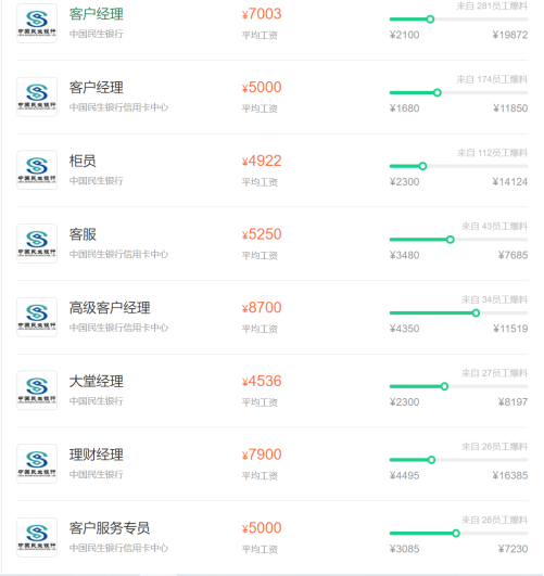 待遇的話在銀行業(yè)中是數(shù)一數(shù)二的,具體的待遇看你做什么崗位了,客戶經(jīng)理(A崗)的話,壓力最大,最能鍛煉人,行員等級上升最快,一年可以調(diào)四次,要是做的好的話,待遇最高,管理崗位的人(B崗)待遇其次,沒有壓力,做的都是中后臺的技術(shù)活,比如說風(fēng)險控制,管理調(diào)控之類的,也是很有前景的,能學(xué)到很多東西,在民生銀行,最差的崗位就是C崗的了,后勤崗,一般都是柜員,辦公室的居多,待遇是相對比較低的,也學(xué)不到很多東西(個人認(rèn)為,C崗的工作我剛畢業(yè)的時候也做過,很折磨人)