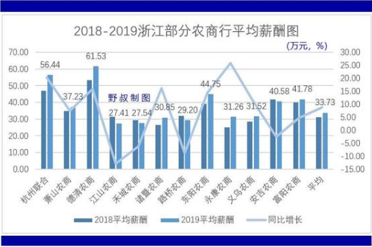 其中,2019年平均薪酬最低的兩家分別是江山農商銀行27.41萬元,禾城農商銀行27.54萬元;最高的兩家分別是德清農商銀行61.53萬元,杭州聯合農商銀行56.44萬元,均高于同期的杭州銀行(城商銀行)和浙商銀行(全國性股份制銀行)這2家浙江上市機構的平均薪酬。